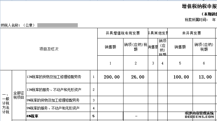 比如一般纳税人,当期取得100的未开票不含税收入,税率13%。开专票收入还有200(不含税),税额26。那么填表如下,当期的未开票收入和税额填写到附表一的5、6列。